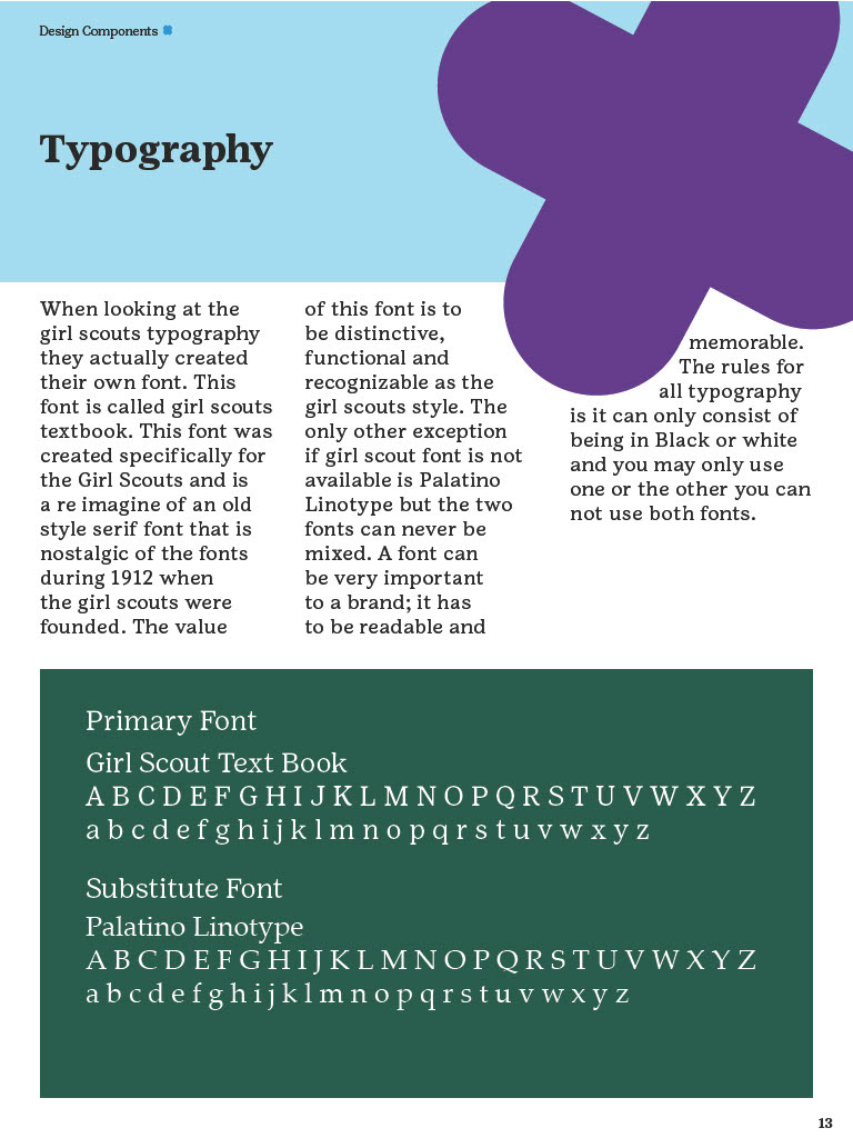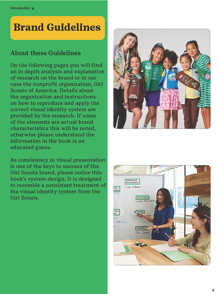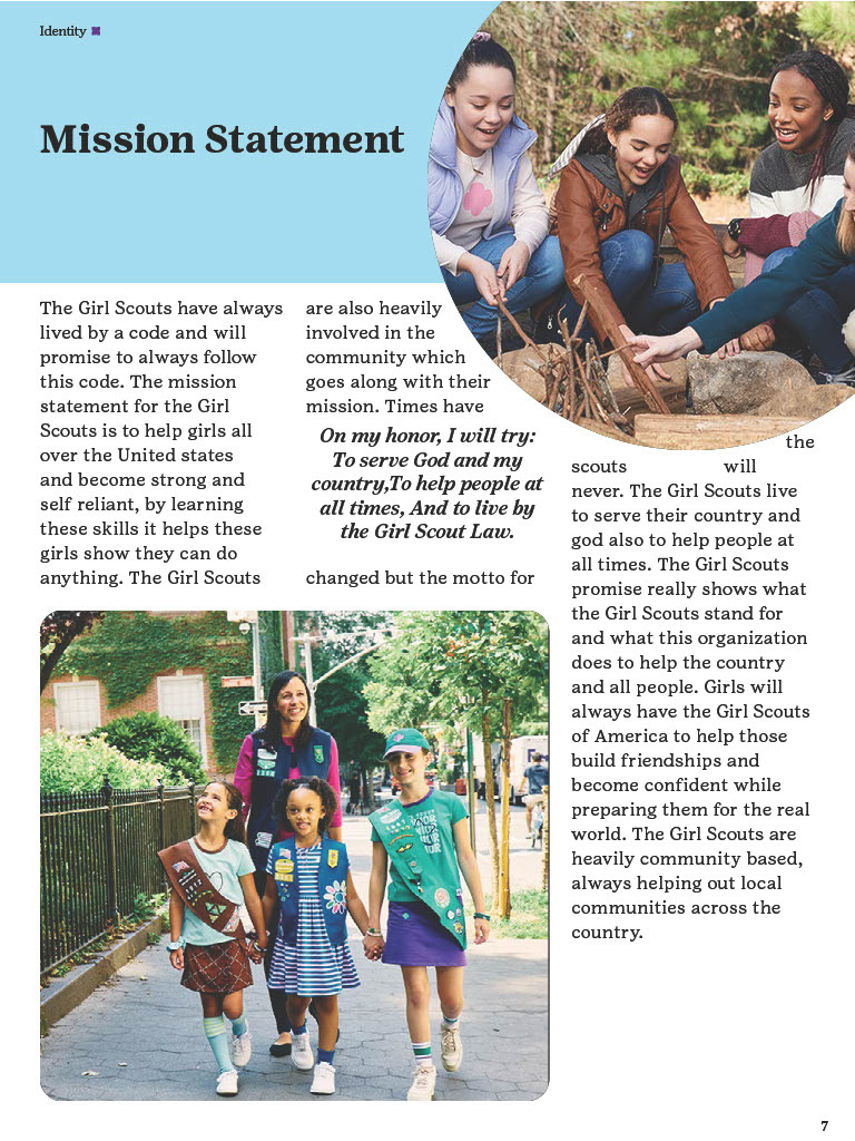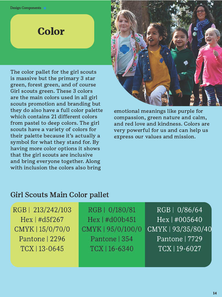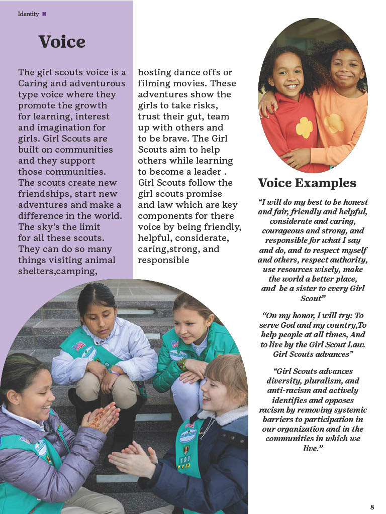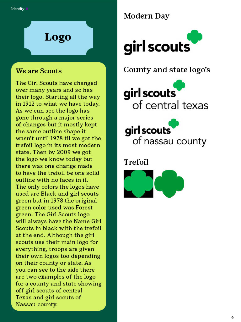 The Brand Guidelines Book was a project to create a guidelines book for a brand or nonprofit organization from the list provided. The reason for this project was to learn about branding and how companies or organizations use branding. During this project I learned a lot about how companies/organizations use branding like how they use specific images, fonts, allow use of their identity, design components and much more. Now to state this project was in no relation to the official girls scouts this is purely for a school project and is intended to display my work and research all images and information belongs to the girl scouts. So, during his project I had to do a lot of research about the girl scouts by looking through their official brand book, documents and other important files given to the public. I would say the only struggles I had during this project was the finding the true branding as we can see in this there is a lot of branding from colors to use and images the problemĀ I mainly rain into was all the state varieties of the girl scouts that followed the brand identity but did have minor differences that would confuse me but in the end they all still had to follow the main branding book no matter what. This project really displayed my work using grids, color pallet, and researching. Overall, this project helped increase my skill of book and brand book creation and how many companies/organizations have specific images they maintain in their design.