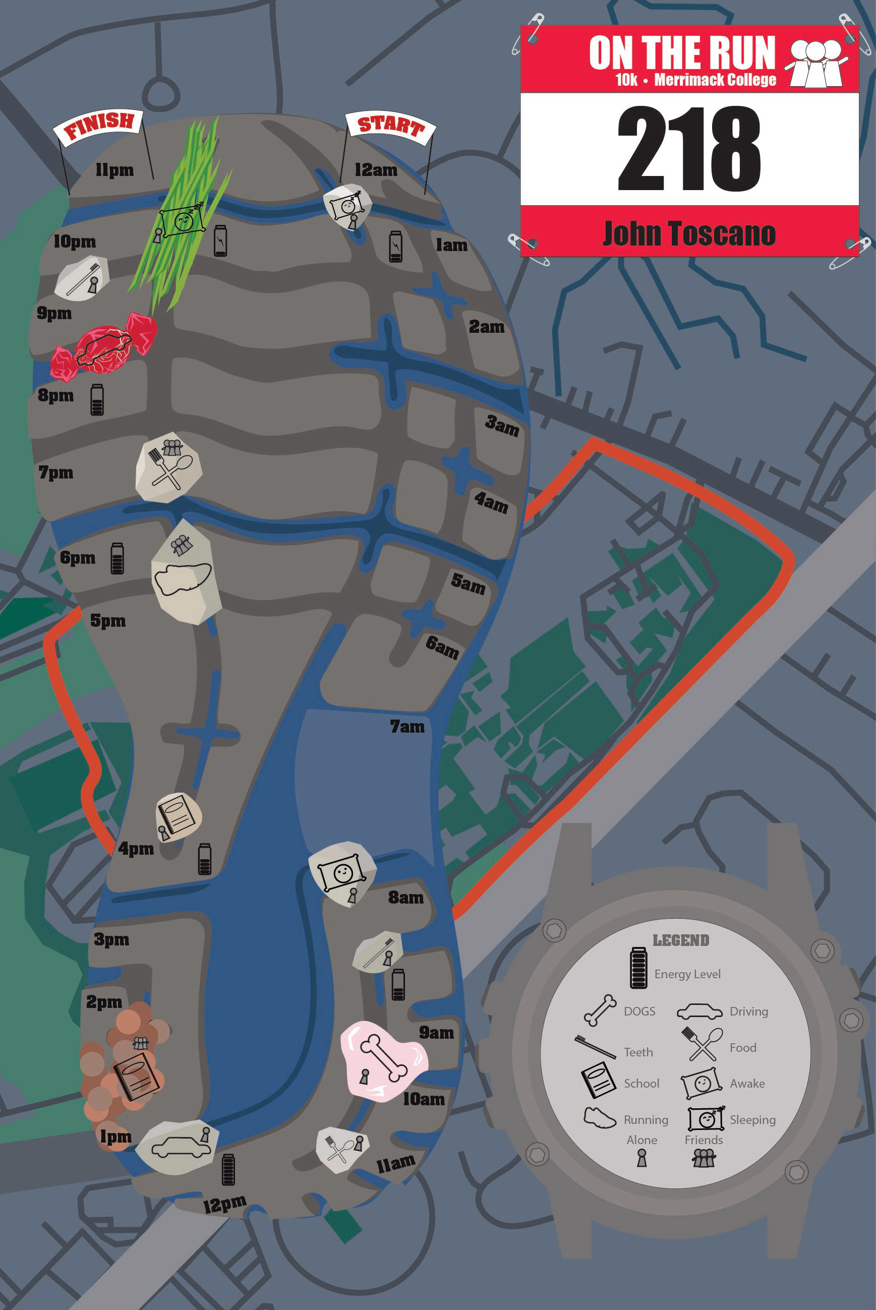 This project follows my day for a whole 24 hours. The purpose of this project was to make a map of one entire day from when you get up to when you go to sleep. My strategy during this project was to keep track of everything I did during the days I wanted to make sure when I had to create the icons, I knew what icons I needed to make by what I did during the day. Throughout the projects you can see a bunch of elements that display certain parts of my day like a shoe, car, food, a bone for dogs, and icons that display other things I did during the day. The main theme of my project was to display a common thing I did during both days I recorded and running came to mind. So, I displayed my project on my typical route, shoes, and my watch. The audience for this project was for people to understand my day throughout icon creation. The background is my typical running route, but I made it in illustrator along with the icons. The icons represent events during my day which can all be found on the watch as the legend. For the elements they were made to help display the icons with a background to show more depth and make them clearer to see. The only problem I ran into during this project was the brightness and color pallet of the background, shoe, and watch I would sometimes have the colors of each object blend and make them look like one combined object. The way I was able to overcome this problem was by adjusting the color of the background and have the color of the shoe and watch darker to make them stand out more. The Mapping Your Day Project really brought out my design skills and ability to create icons that represents aspects of my day.